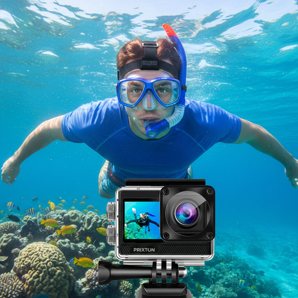 Includes a waterproof case that allows the camera to be submerged up to 30 meters, perfect for diving, snorkeling, surfing, and water activities.