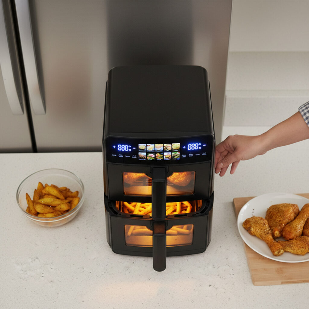 The air fryer features two stacked and separate baskets, each with a 5 L capacity, allowing you to cook in parallel without cross-contaminating preparations. Its compact design prevents the mixing of odors, flavors, or food residues, with a total capacity of 10L.
