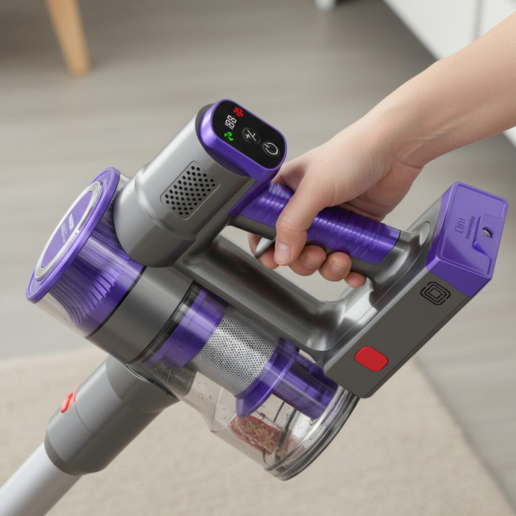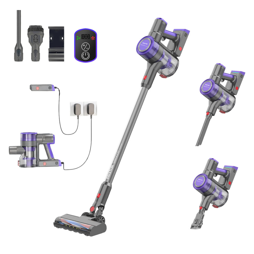 It features an informative LED display to monitor battery status and suction speed. Additionally, the floor brush is motorized and equipped with an LED light to improve visibility while cleaning.